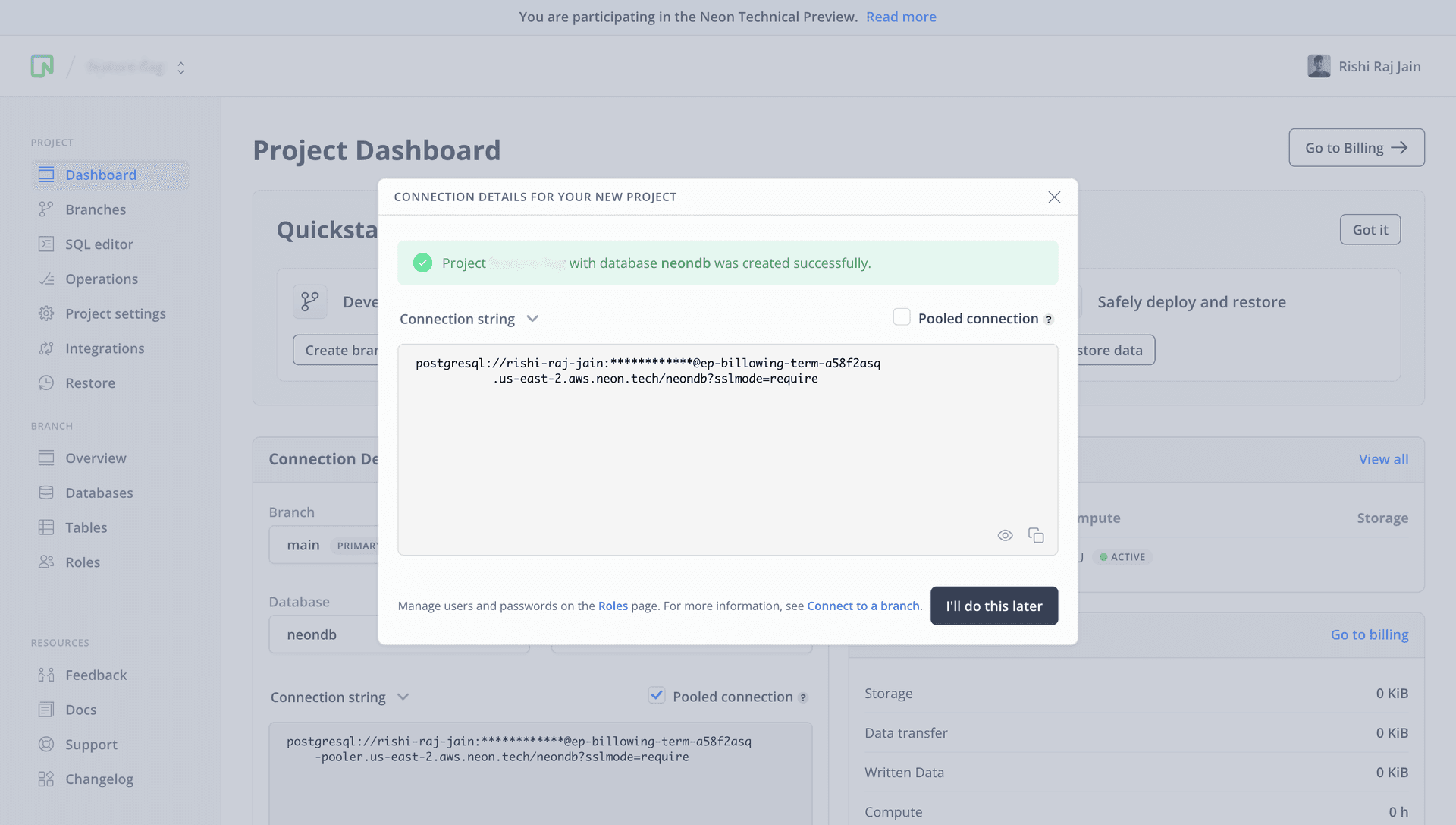 To get started, go to the Neon console and create a new project by entering a project name of your choice.
