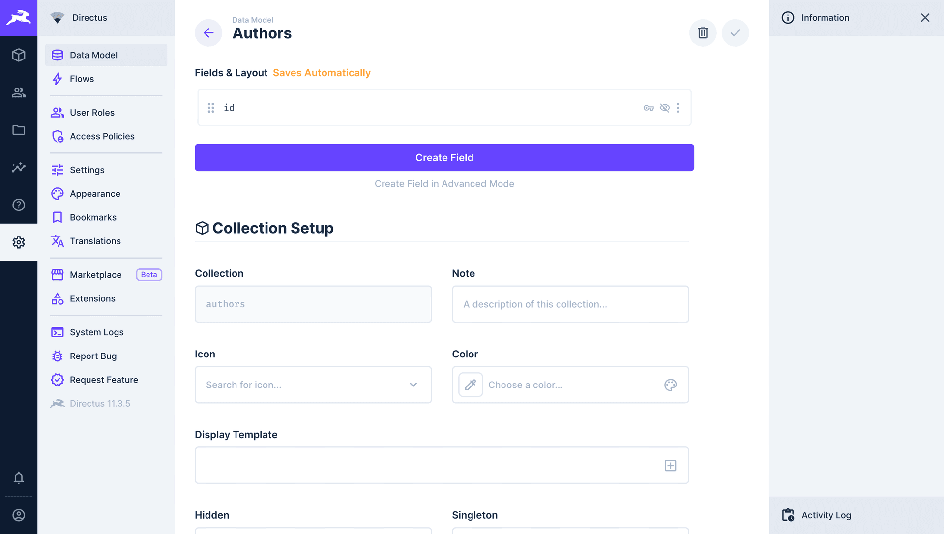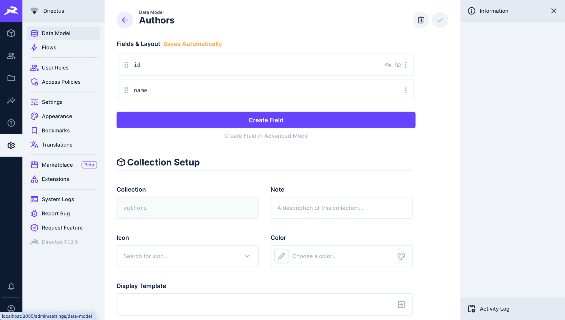 Set the Name field to authors, press the next arrow icon, and save by clicking the tick icon.