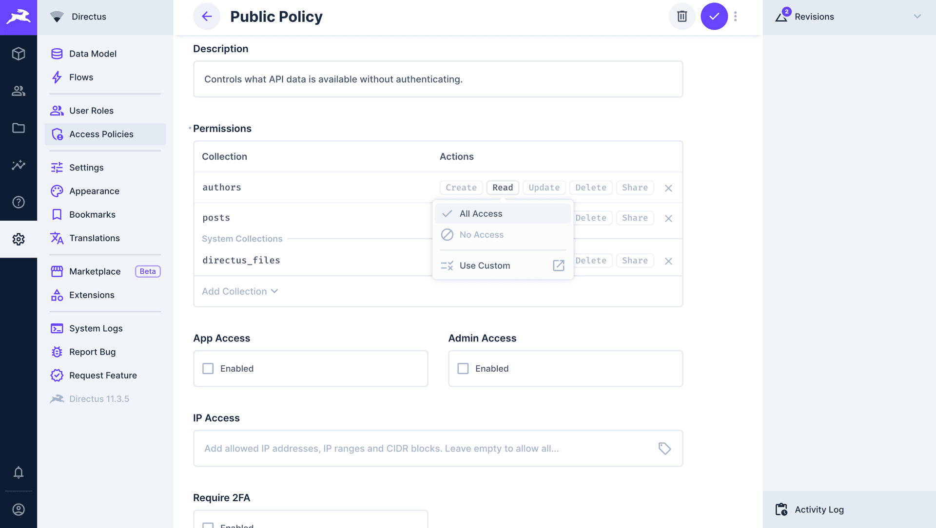 To be able to fetch the data authored in your local Directus CMS instance, you will need to configure what is readable and writeable using APIs. Navigate to Settings > Access Policies, click on Public, and add the permissions for the authors, posts and directus_files to be read publicly.