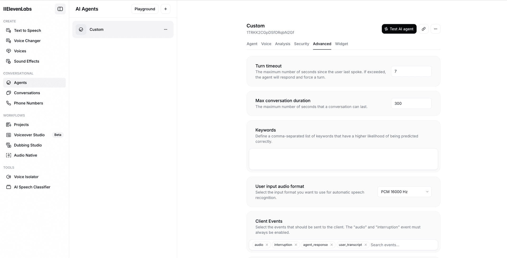 Next, go to Advanced > Client Events in your Agent settings, and add two events named agent_response and user_transcript.